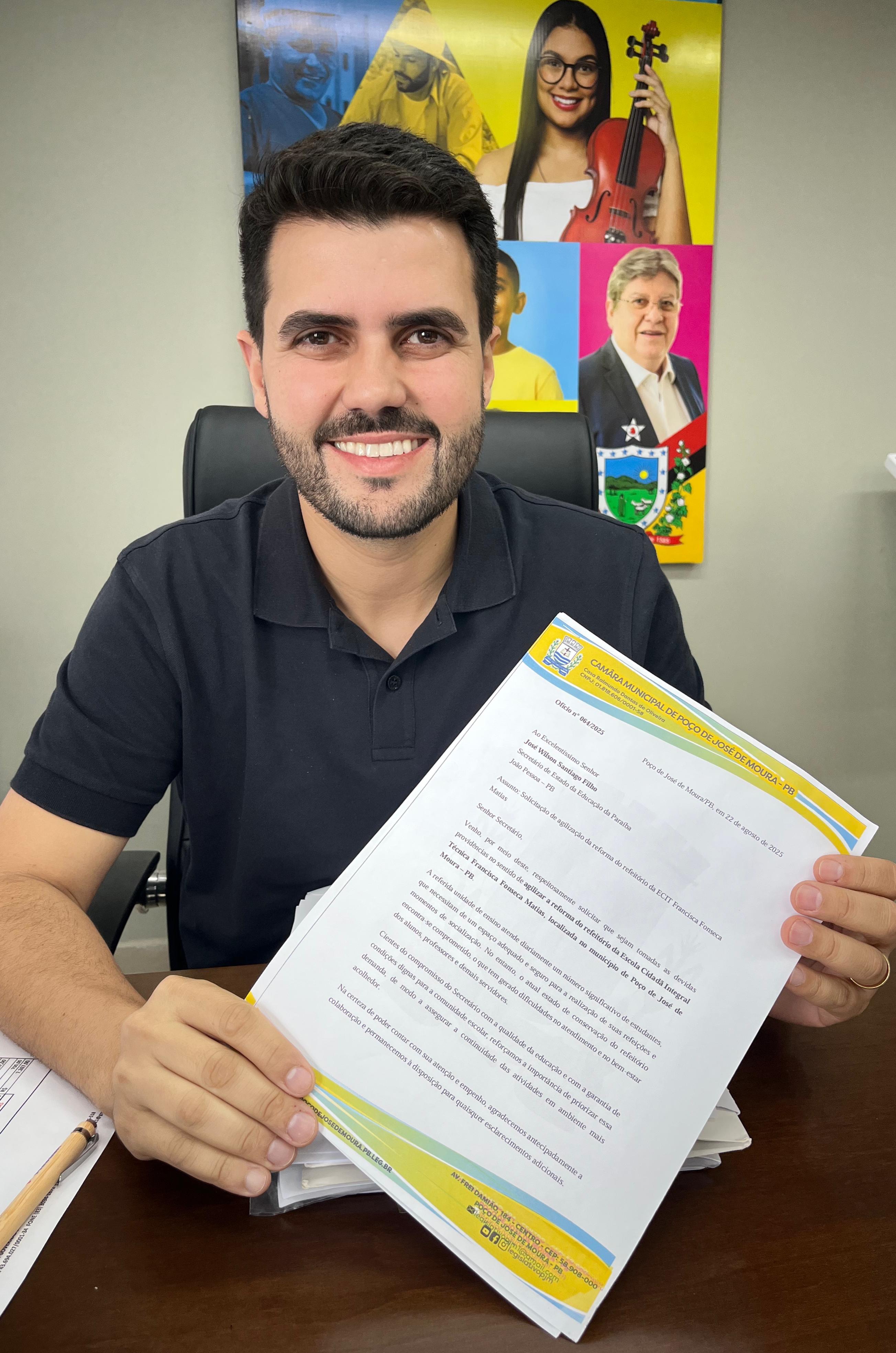 A Vereafora e Presidente da Câmara de Poço de Jose de Moura, Paula Batista, protocolou requerimento na Câmara e oficializou com o Secretário de Educação do Estado, Wilson Filho, pedido para viabilização de término da reforma do refeitório da ECIT? Francisca Fonseca Matias.