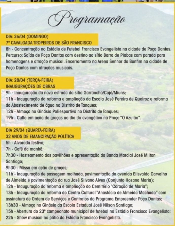 A Prefeitura de Poço Dantas divulgou a programação oficial do aniversário de 32 anos do município que acontecerá no dia 29 de abril.
